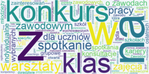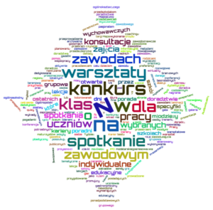 konsultacje indywidualne z doradca zawodowym, pomoc w planowaniu ścieżki kariery zawodowej, przygotowanie IPD, określanie kompetencji i zainteresowań zawodowych, zajęcia dla uczniów klas 8 prowadzone metodami coachingu grupowego, konkurs BHP, warsztaty zawodoznawcze, ogólnoszkolny konkurs plastyczny, przeprowadzenie w wybranych szkołach regionu gier z zakresu doradztwa zawodowego, spotkania grupowe. gra terenowa, lekcja archiwalna, konkurs na Audiowizualną Prezentację, konkurs skierowany do młodzieży ostatnich klas szkół średnich lub branżowych, warsztaty dla uczniów kl. VII i VIII, zajęcia warsztatowe dla uczniów klas I liceum ogólnokształcącego, konferencja, indywidualne poradnictwo zawodowe, konsultacje indywidualne, galeria prac, spotkanie z doradcą zawodowym z Powiatowego Urzędu Pracy, warsztaty rozwojowe dla uczniów ostatnich klas szkół ponadpodstawowych, warsztaty są dedykowane przedszkolakom, warsztat doradczo – rozwojowy, na godzinach wychowawczych lekcje, warsztaty z ceramiki, konkurs, konsultacje z rodzicami, dni otwarte w poradnictwie zawodowym, lekcje, zajęcia edukacyjne, spotkanie grupowe na doradztwie zawodowym, udział klas w Konferencji, gazetki tematyczne, pogadanki na lekcjach wychowawczych i doradztwie zawodowym,